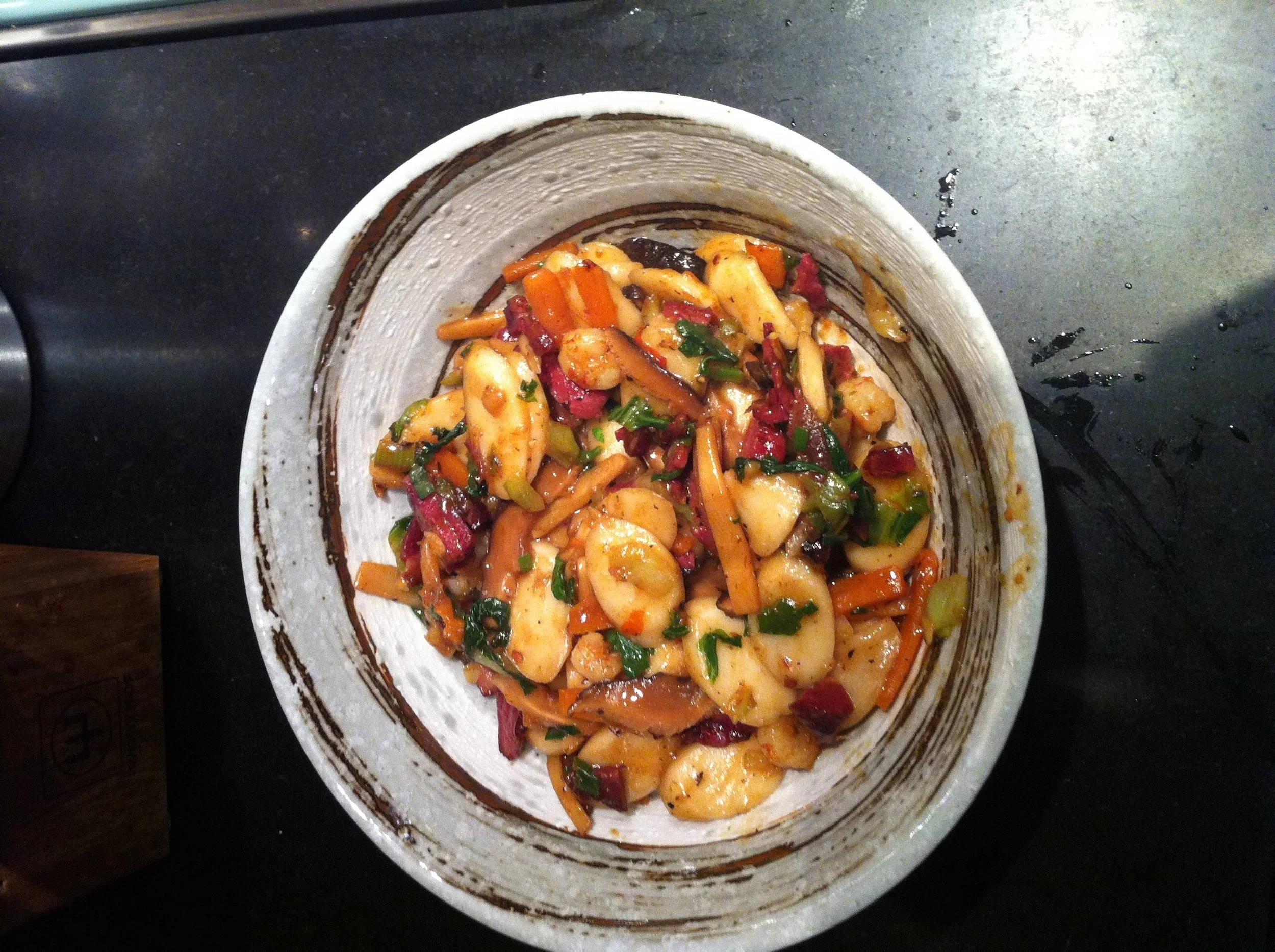 Cook and remove shrimp, squid and scallops and add to bowl of sausage and chicken